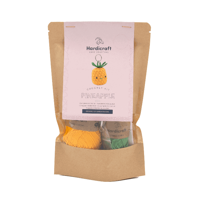 Pimp je tas met deze schattige Ananas tashanger. Elke (school)tas of sleutelbos heeft er toch één nodig! Dit pakket bevat een patroon, kwaliteitsgaren van 100% katoen en alle fournituren die nodig zijn om aan het werk te gaan (excl. haaknaald). De Ananas is ongeveer 9 cm hoog en is gemaakt met een haaknaald 2,5 mm.